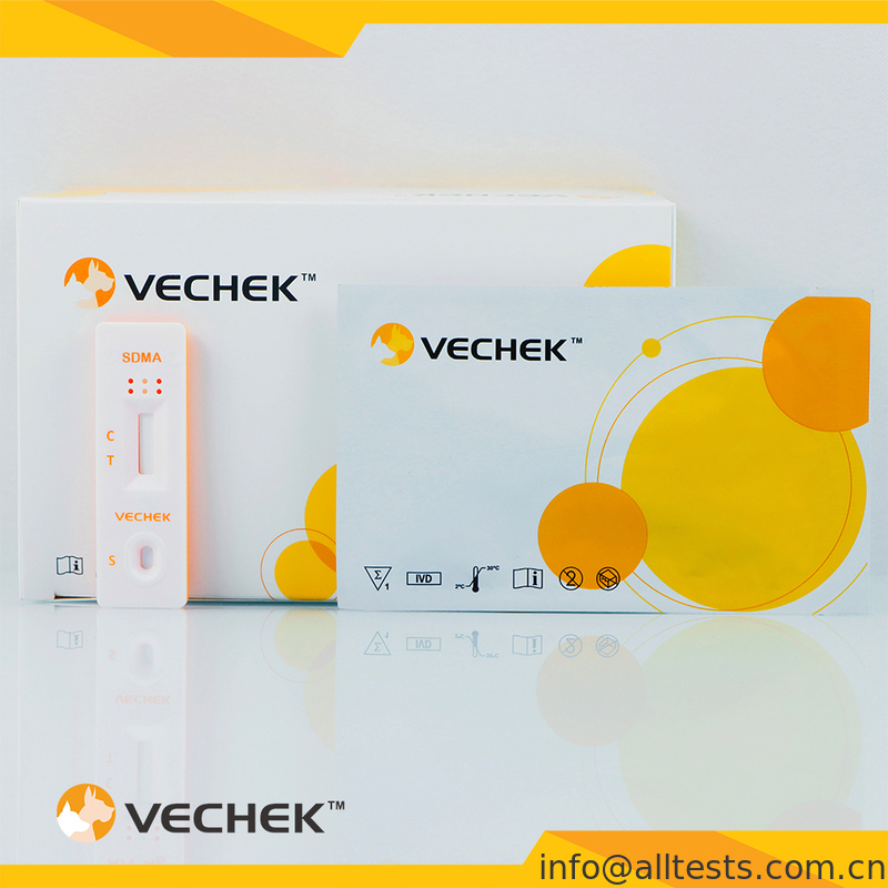 Кассета быстрого теста на симметричный диметиларганин (SDMA) основана на конкурентном иммунохроматографическом анализе бокового потока.Кассета для испытаний содержит окно для наблюдения за ходом анализов и показания результатов.В окне испытания есть невидимая зона T (испытательная) и зона C (контрольная) перед выполнением анализа.SDMA в образце будет конкурировать с антигеном SDMA, покрытым на мембране с антителом SDMA, помеченным коллоидными частицами золотаЧем меньше SDMA в образце, тем больше вероятность того, что антитела к SDMA, соединенные с коллоидными частицами золота, могут быть захвачены антигеном SDMA, покрытым мембраной.Интенсивность линии T пропорциональна концентрации SDMA в образцеТаким образом, тест-кассета может точно указать наличие симметричного диметиларганина (SDMA) в образце.